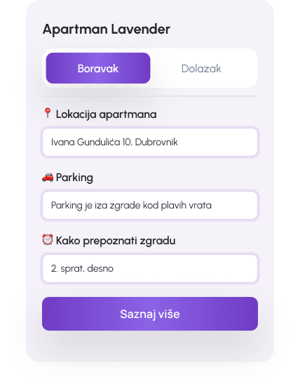 Da, link možete poslati gostu odmah nakon potvrde rezervacije putem Booking-a, Airbnb-ja, WhatsApp-a ili bilo koje druge poruke. Na taj način gost dobija informacije o dolasku, parkiranju i ulasku prije nego što stigne, što značajno smanjuje broj pitanja i poruka uoči dolaska.